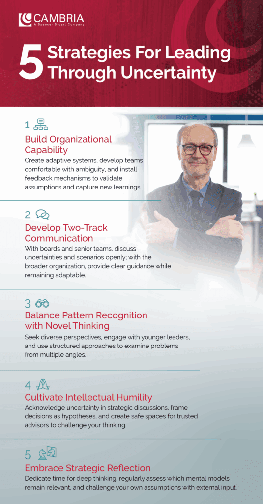 The most successful senior executives are those who embrace this paradox: leveraging their crystallized intelligence to identify patterns while maintaining enough fluid intelligence to recognize when to question those patterns. They understand when and how to remain open to new information, holding multiple, competing possibilities in mind simultaneously. The ability to hold various competing possibilities in mind while still moving forward with a clear direction is perhaps the most crucial skill for modern senior executives. It requires developing comfort with ambiguity while providing the clarity their organizations need. The goal is not to eliminate uncertainty but to learn how to operate effectively within it.